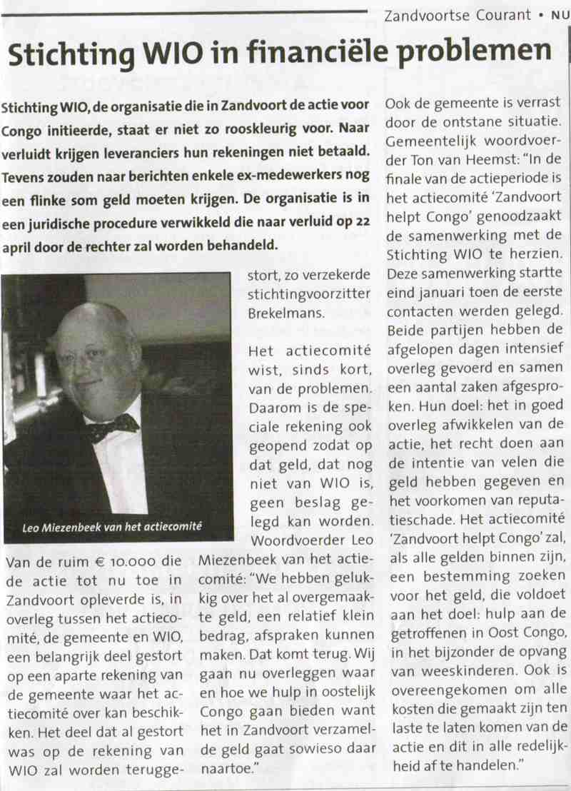 Stichting WIO in financiele problemen Source: www.zvoort.nl Publication date: April 2009 Organizations: World Initiative for Orphans (WIO)Persons: Maarten Brekelmans Attachments krantenknipsel-zandvoortse-courant-congo-wio1.jpg (82770 Bytes)