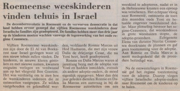 Roemeense weeskinderen vinden tehuis in Israel Source: resolver.kb.nl Publication date: 26 January 1990 Nieuw Israelietisch weekblad26-01-19900Countries: Israel, Romania Attachments Roemeense weeskinderen Israel.jpg (69513 Bytes)