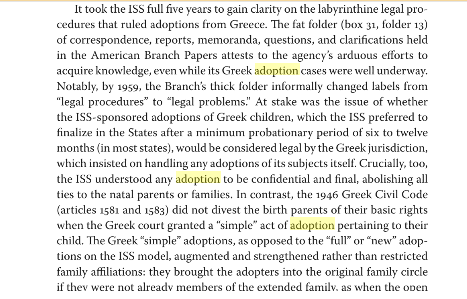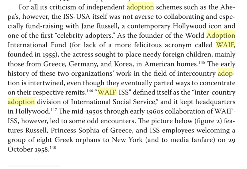 Adoption, Memory, and Cold War Greece: Kid pro quo? (WAIF/ISS)Document type: News paper article Book: Adoption, Memory, and Cold War Greece: Kid pro quo?https://books.google.nl/books?id=ppe4DwAAQBAJ&pg=PA112&lpg=PA112&dq=adoption+WAIF&source=bl&ots=fX0hBfdOsK&sig=ACfU3U0gzGKavpajlqUFcXplNWGWgFyjZw&hl=en&sa=X&ved=2ahUKEwi-mLjR-OjnAhVGy6QKHe1CDvAQ6AEwAnoECAkQAQ#v=onepage&q=WAIF&f=falseCountries: GreeceOrganizations: International Social Service (ISS) - Germany, International Social Service (ISS), World Adoption International Fund (WAIF)Persons: Jane Russell Attachments WAIF ISS.png (183658 Bytes) Greece ISS.png (230622 Bytes) ISS Greece Jewish.png (230479 Bytes)