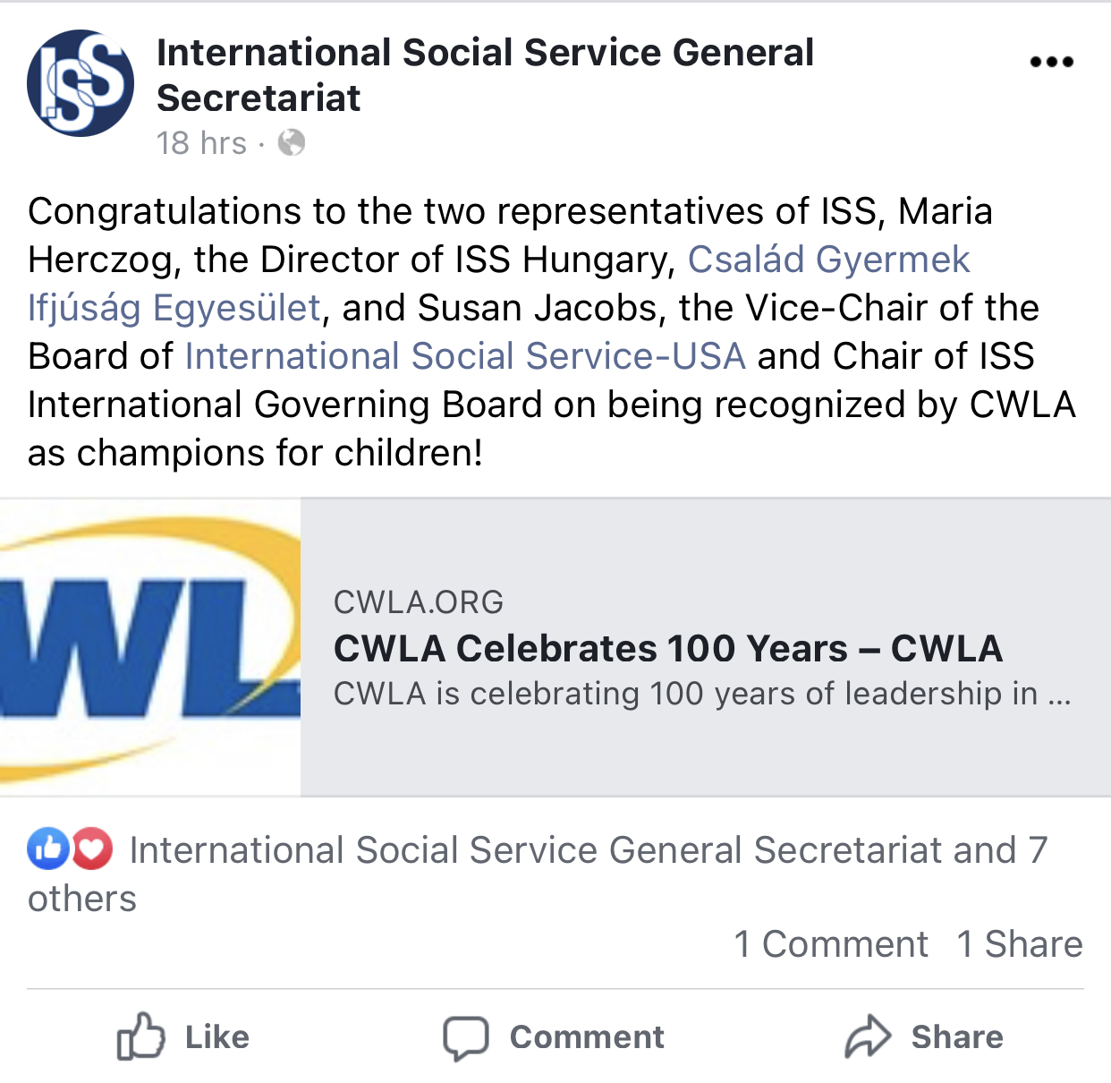 ISS International Governing Board recognised by CWLA as champions for children!Document type: News paper article Publication date: 22 December 2020 .Organizations: International Social Service (ISS) - Germany, International Social Service (ISS)Persons: Susan S. Jacobs, Maria Herzcog aka Maria Herzog Attachments IMG_2254.jpg (610814 Bytes)