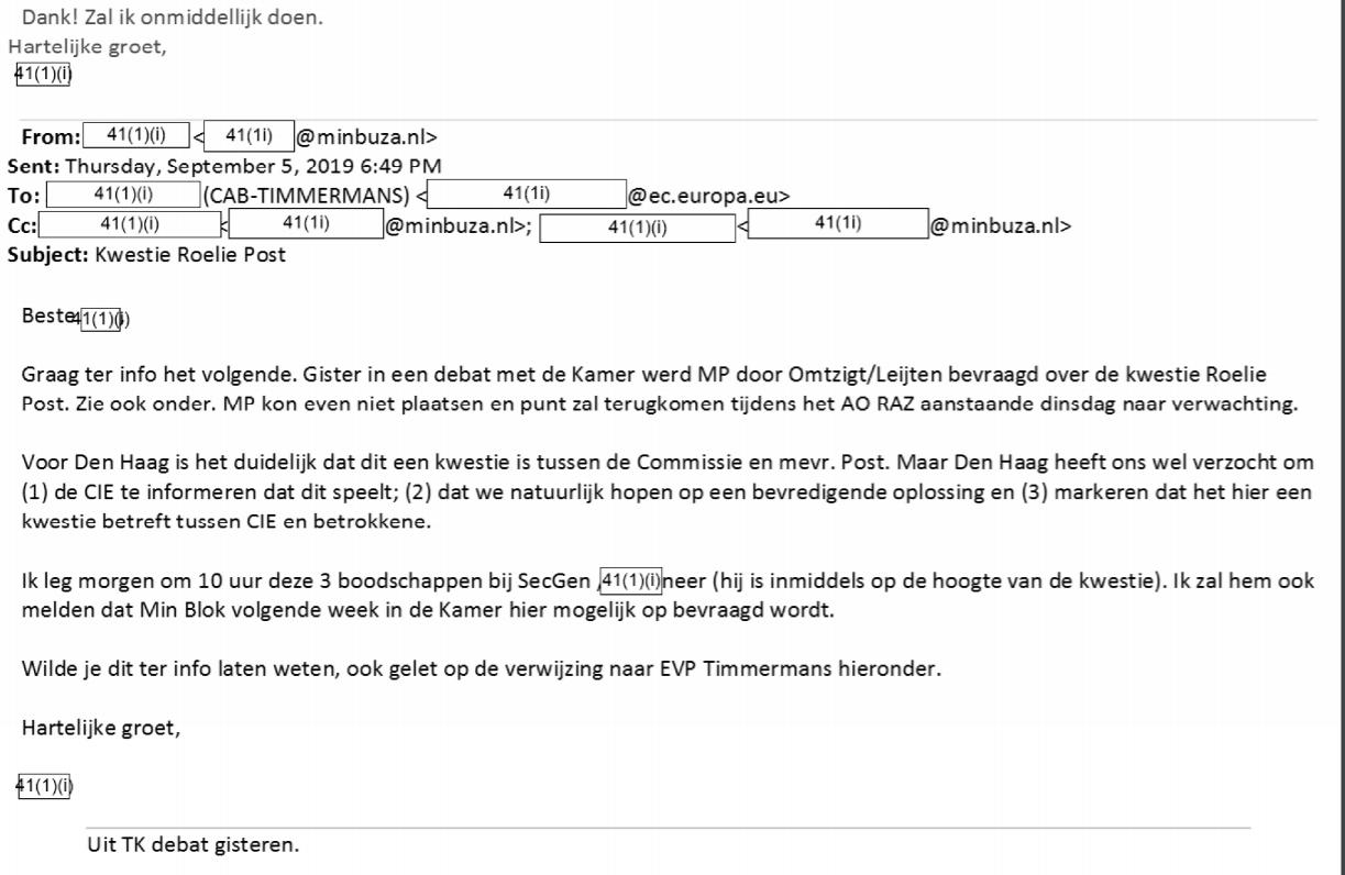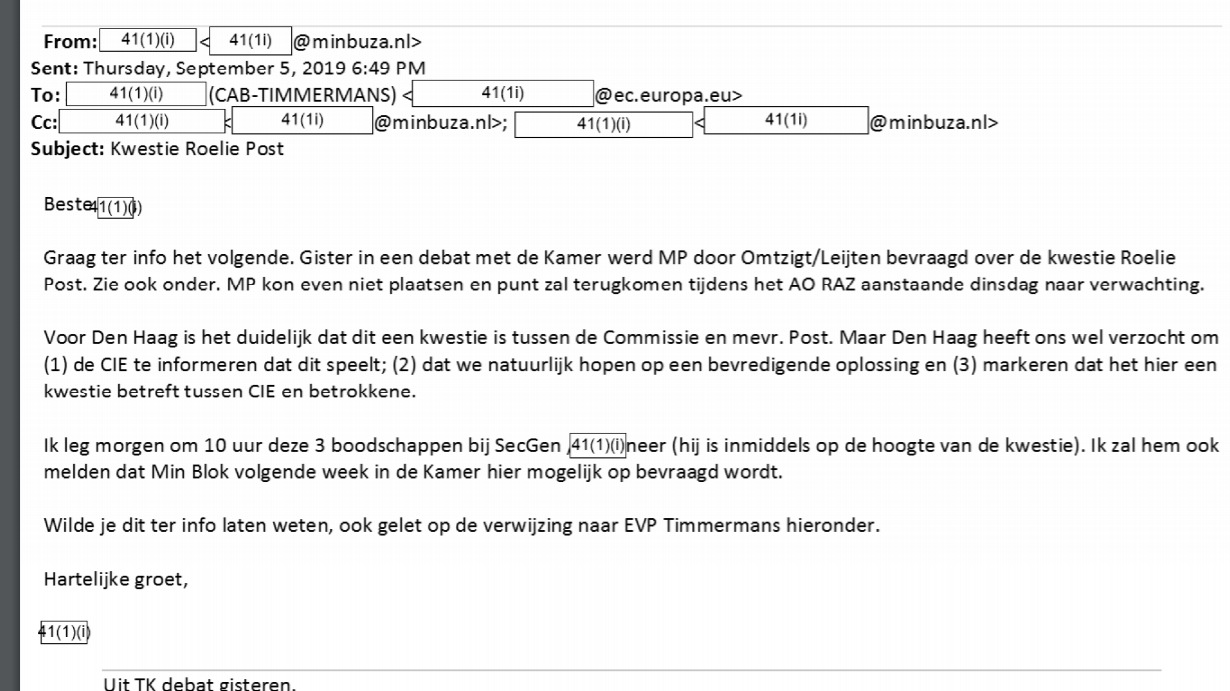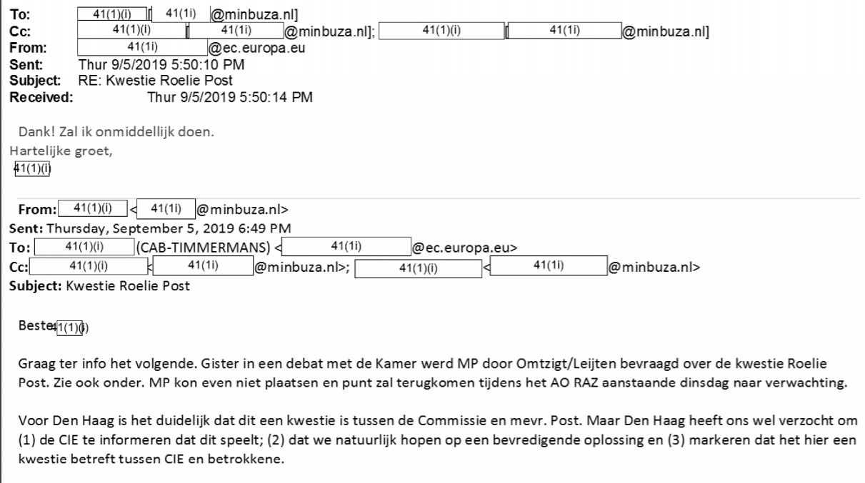 Mail exchange Dutch Ministry and European Commission: Kwestie Roelie Post