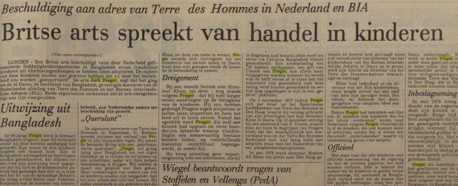 Beschuldiging aan adres van Terre des Hommes in Nederland en BIA Source: www.delpher.nl Publication date: 1 August 1979 Countries: Bangladesh, NetherlandsOrganizations: Bureau Interlandelijke Adoptie (BIA), Terre des Hommes Netherlands Attachments Britse arts spreekt van kinderhandel Bangladesh 1979.pdf (203043 Bytes) Preger 2.jpg (93202 Bytes)