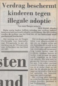 Verdrag beschemt kinderen tegen illegale adoptie Source: resolver.kb.nl Publication date: 1 June 1993 De Telegraaf01-06-19933Countries: NetherlandsOrganizations: Hague Convention on Protection of Children and International Cooperation in respect of Intercountry Adoption (1993) Attachments Verdrag beschermt kinderen 1993.jpg (16583 Bytes)