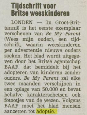 BAAF MAgazine Be My Parent Source: resolver.kb.nl Publication date: 12 October 2010 Het vr?e volk : democratisch-socialistisch dagblad12-10-19900Countries: United Kingdom Attachments BAAF Tijdschrift.jpg (27392 Bytes)