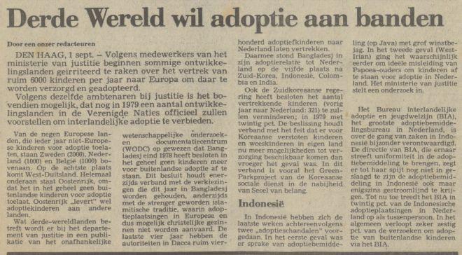 Derde Wereld wil adopties aan banden Source: resolver.kb.nl Publication date: 1 September 1979 NRC Handelsblad01-09-19799Countries: NetherlandsOrganizations: Bureau Interlandelijke Adoptie (BIA) Attachments Adopties aan banden.jpg (63641 Bytes)