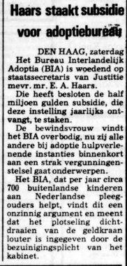 Haars staakt subsidie voor adoptiebureau Source: resolver.kb.nl Publication date: 17 May 1980 De Telegraaf17-05-19800Countries: NetherlandsOrganizations: Bureau Interlandelijke Adoptie (BIA) Attachments Haars BIA.jpg (27650 Bytes)