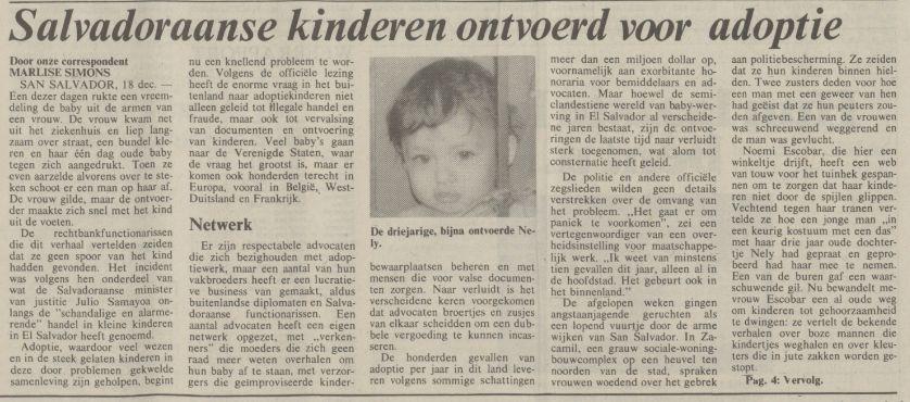Salvadoraanse kinderen ontvoert voor adoptie Source: resolver.kb.nl Publication date: 18 December 1985 NRC Handelsblad18-12-19855Countries: El Salvador, United States of America, Netherlands Attachments Salvadoraanse kinderen ontvoerd.jpg (84932 Bytes)