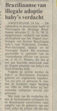 Braziliaanse van illegale adoptie baby's verdacht Source: resolver.kb.nl Publication date: 24 February 1983 NRC Handelsblad24-02-19833Countries: United States of America, Brazil, Spain, Germany, Netherlands, Sweden Attachments Braziliaanse verdacht.jpg (20343 Bytes)