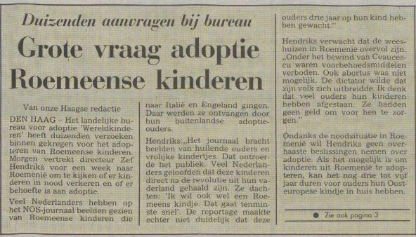 Grote vraag adoptie Roemeense kinderen Source: resolver.kb.nl Publication date: 10 January 1990 Limburgsch dagblad10-01-19900Countries: Netherlands, RomaniaOrganizations: Wereldkinderen aka NICWOPersons: Zef Hendriks Attachments Limburgs Dagblad Roemenie.jpg (51337 Bytes)
