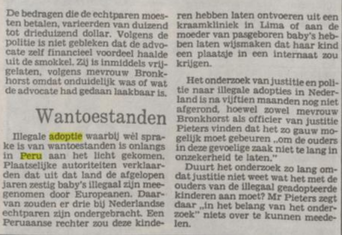 Illegaal adopteren vaak een noodsprong; We schamen ons hier helemaal niet voor (investigation NL Peru is ongoing) Source: resolver.kb.nl Publication date: 1 January 1983 Het Parool16-05-19833Countries: Brazil, Peru, NetherlandsOrganizations: Bureau Interlandelijke Adoptie (BIA)Persons: Miek de Langen, Ermelina Reijinga Attachments Peru 1983.png (408844 Bytes)